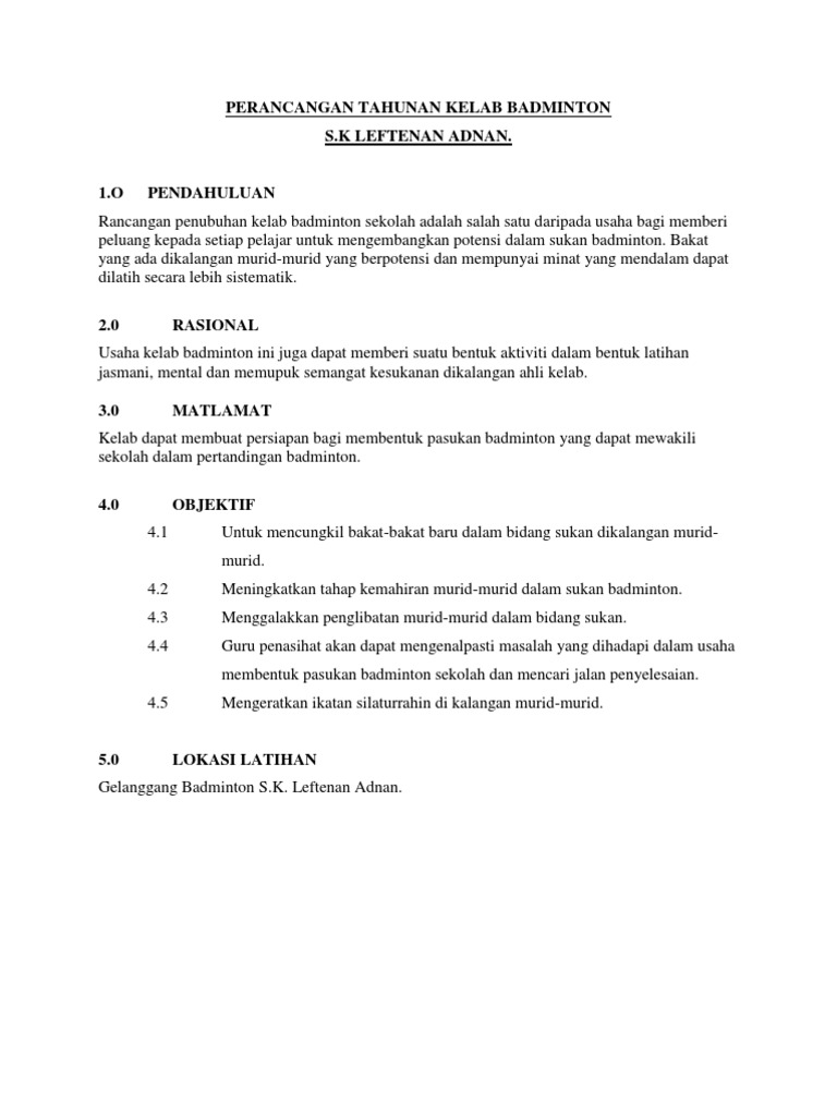 Draft Kertas Kerja Penubuhan Kelab Badminton