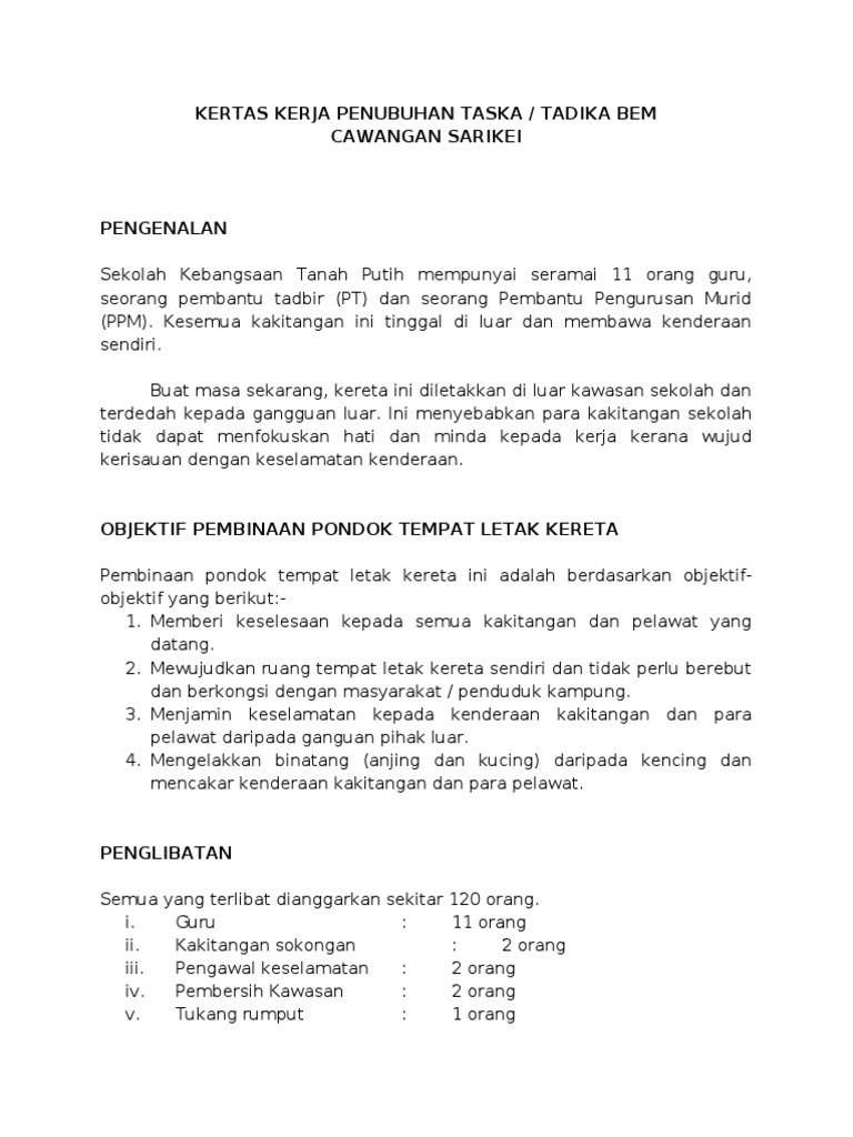 Kertas Kerja Pembinaan Pondok Kereta
