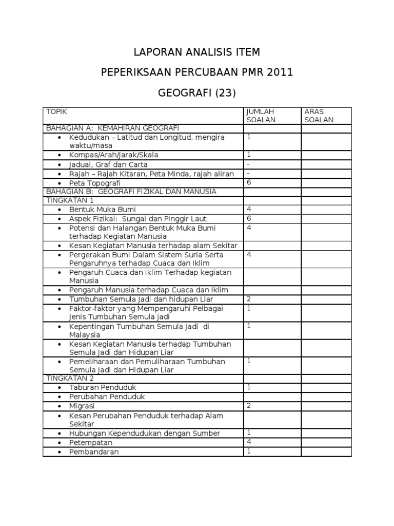 Laporan Analisis Item Percubaan Geografi Pmr 2011
