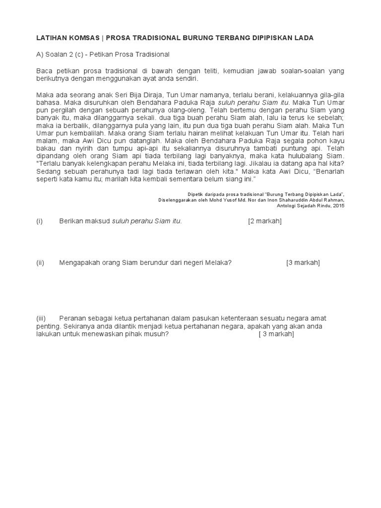Semoga pelajar dapat merujuk format soalan spm sebenar. Semoga perkongsian nota nota rujukan bahasa melayu contoh. Soalan kbat komsas tingkatan 5. Sinopsis tema persoalan watak dan perwatakan latar masa latar tempat latar masyarakat gaya bahasa binaan plot teknik plot nilai pengajaran soalan peperiksaan skema jawapan contoh soalan jawapan prosa tradisional burung terbang dipipiskan lada k1.