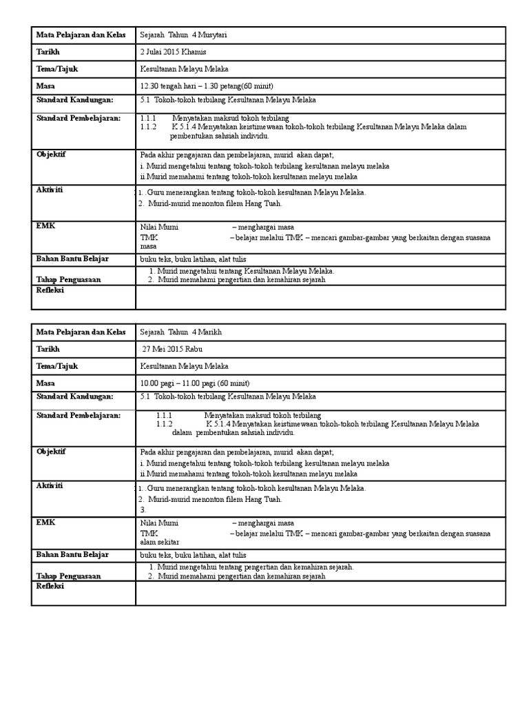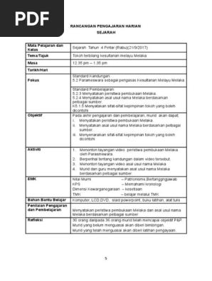 Rancangan Pengajaran Harian Sejarah Tahun 4 Topik 5 1 1