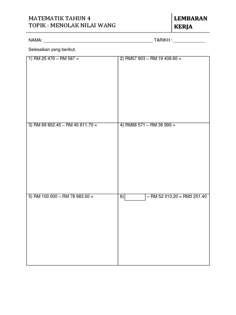 Matematik Tahun 4 Topik Menolak Nilai Wang Lembaran Kerja