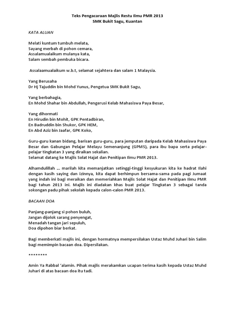 Teks Pengacaraan Majlis Restu Ilmu Pmr 2013 Semisa