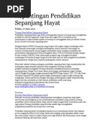 Pendidikan sepanjang hayat merupakan aktivitas pembelajaran yang dilakukan oleh individu kelompok secara seumur hidup sukarela dan memotivasi diri untuk terus mengikuti kemajuan ilmu pengetahuan tekhnologi dan seni baik untuk alasan pribadi maupun professional. Proses pendidikan itu berlangsung sepanjang hayat. Hakikatnya proses ini bersifat dinamik dan tidak noktah. Pendidikan sepanjang hayat psh bermaksud proses belajar dan mengajar apa apa sahaja bidang ilmu bermula dari buaian hingga ke liang lahad.