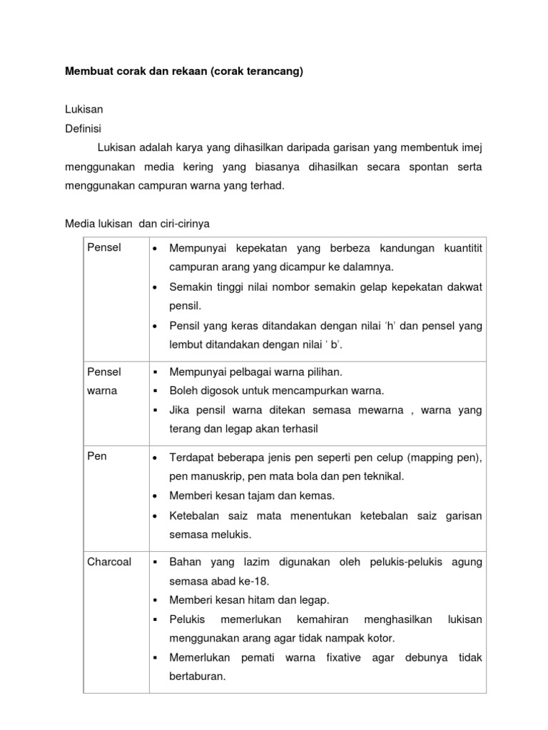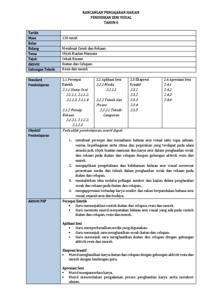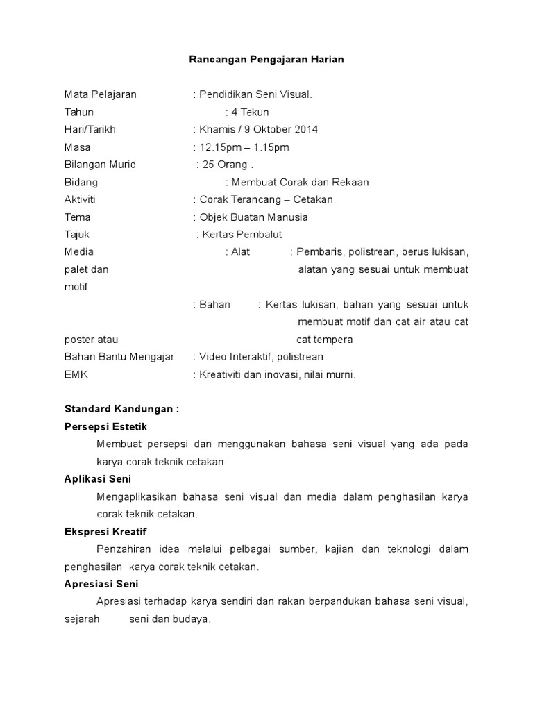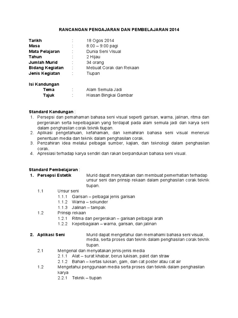14 Membuat Corak Dan Rekaan Lukisan Doc Rancangan Pengajaran Harian Pendidikan Seni Visual Tahun 4 Tarikh Masa Kelas Bidang Tema Tajuk Aktiviti Course Hero