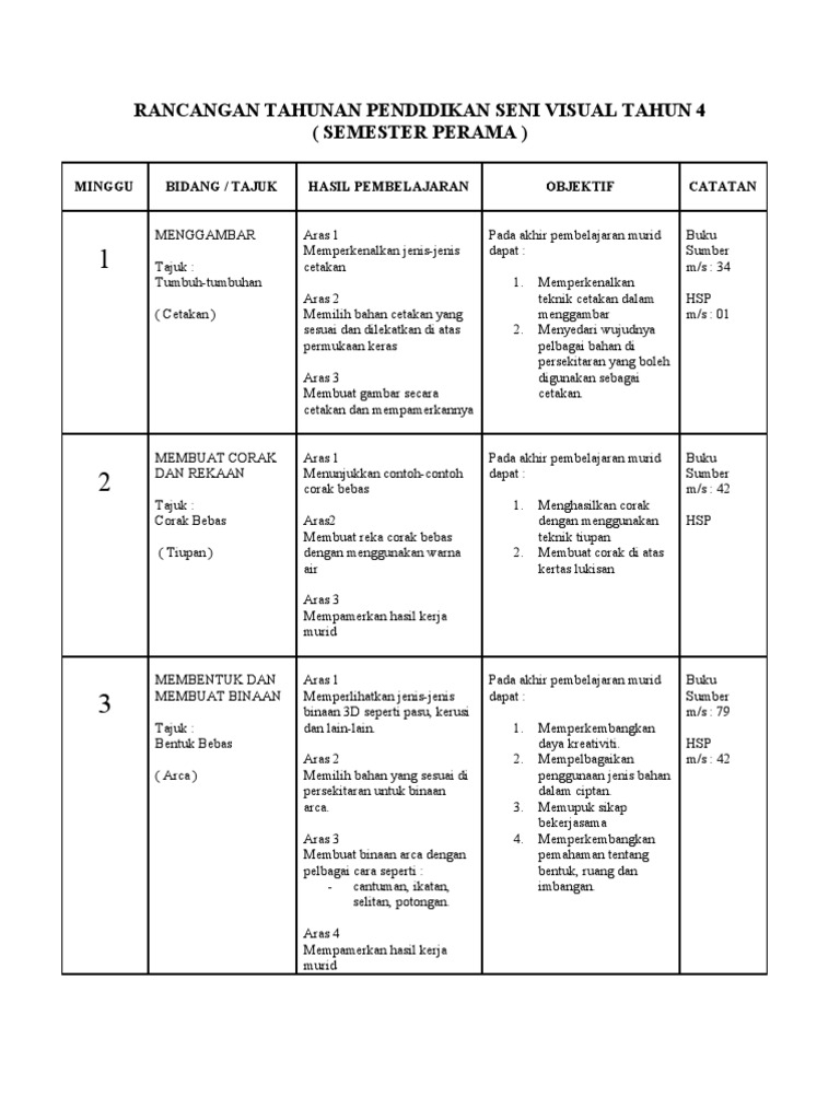Rancangan Tahunan Pendidikan Seni Visual Tahun 4 Semester Perama