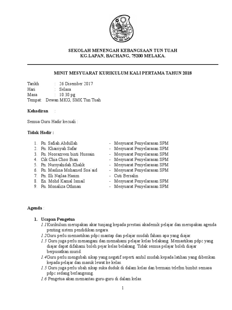 Minit Mesyuarat Kurikulum Bil 1 2019 Pages 1 9 Text Version Anyflip