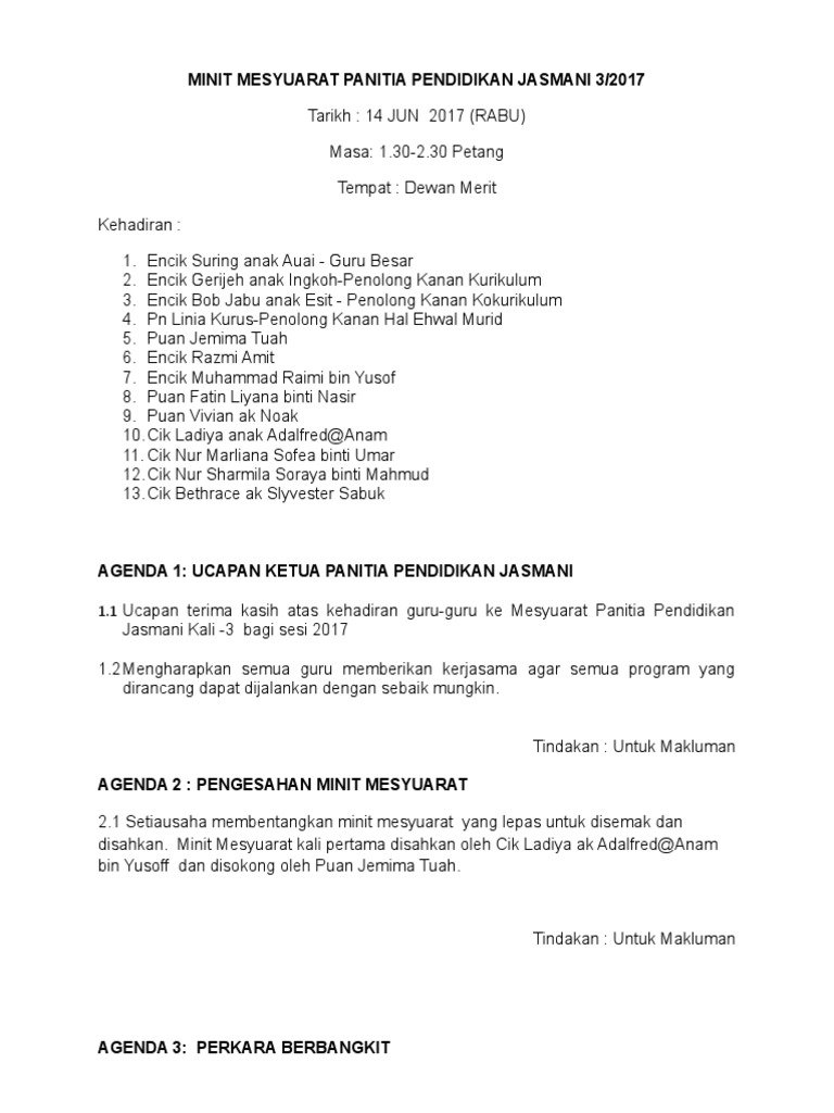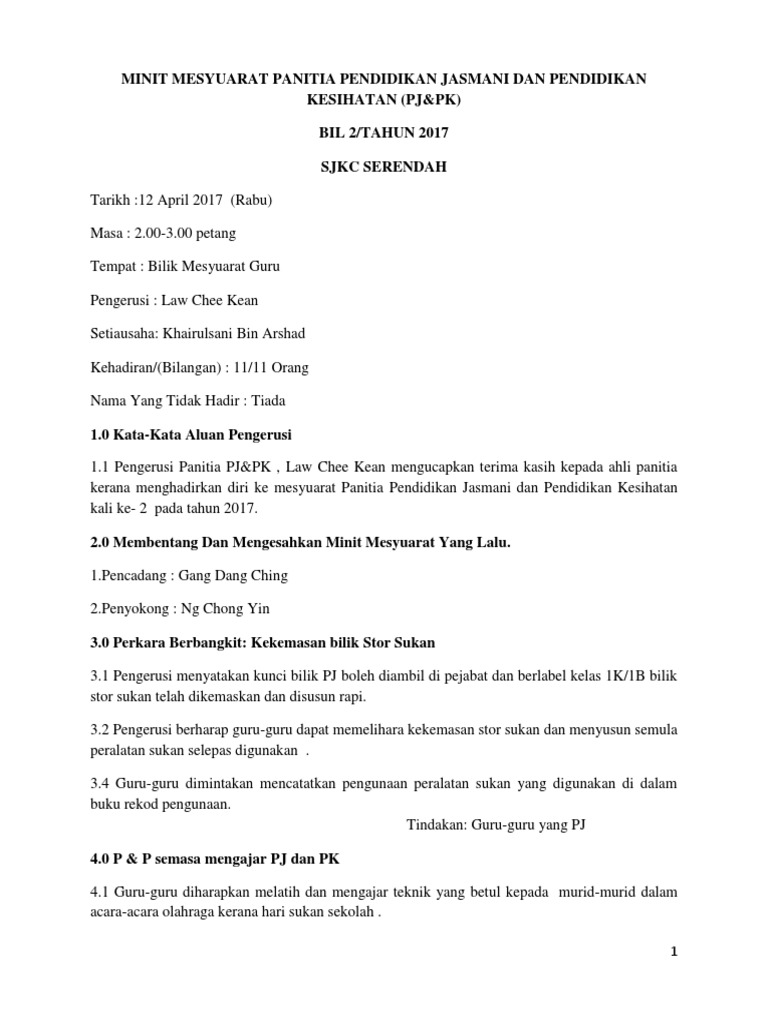 Doc Contoh Minit Mesyuarat Panitia Pendidikan Jasmani Kali Izzat Idris Academia Edu