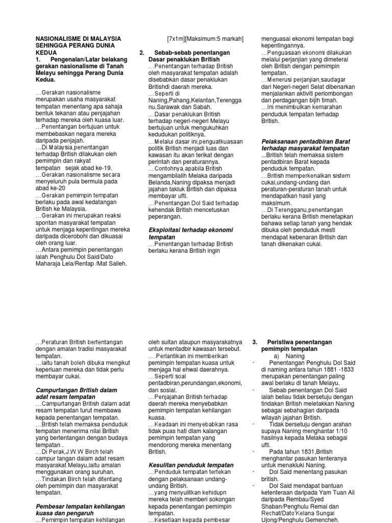 Nasionalisme Di Malaysia Sehingga Perang Dunia Kedua Kertas 3 Sejarah