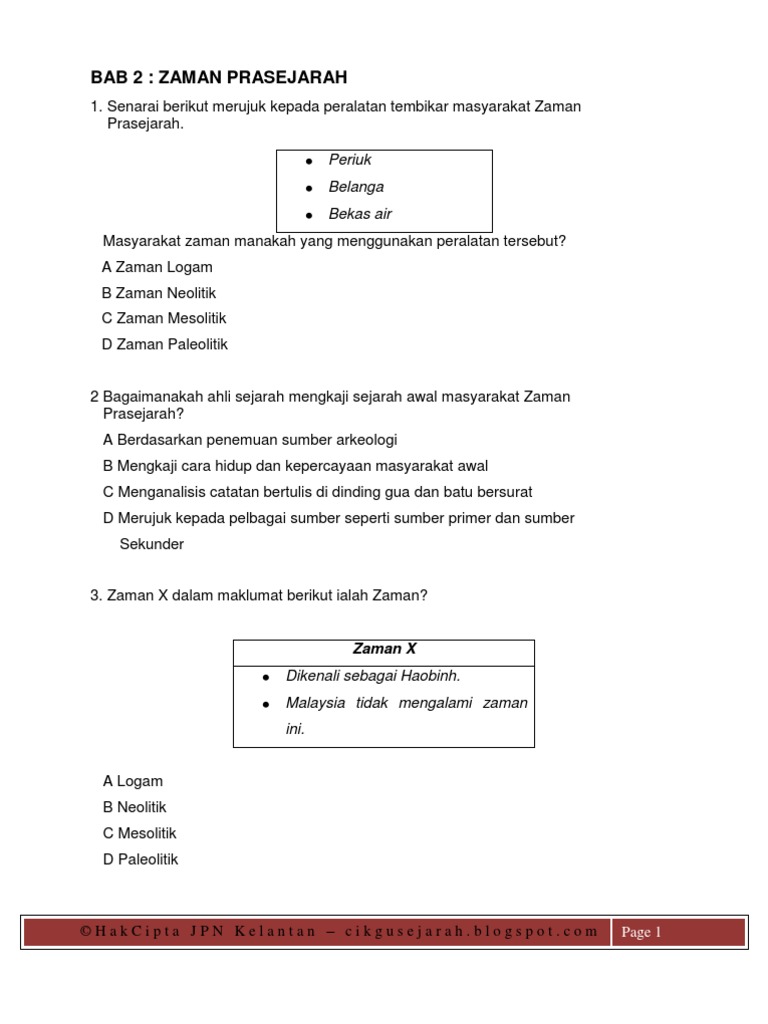 Learn vocabulary terms and more with flashcards games and other study tools. Puan norizan bt ahmad jaffri smk seri bentong standard kandungan 1 maksud zaman prasejarah 2 lokasi zaman prasejarah di dunia 3 ciri ciri kehidupan manusia zaman prasejarah 4 kesinambungan sumbangan zaman prasejarah kepada kemajuan kehidupan manusia 5 zaman prasejarah di malaysia 3 1 maksud zaman prasejarah. Bab 3 zaman prasejarah tingkatan 1 duration. Pada zaman bilakah peralatan batu ini dicipta.