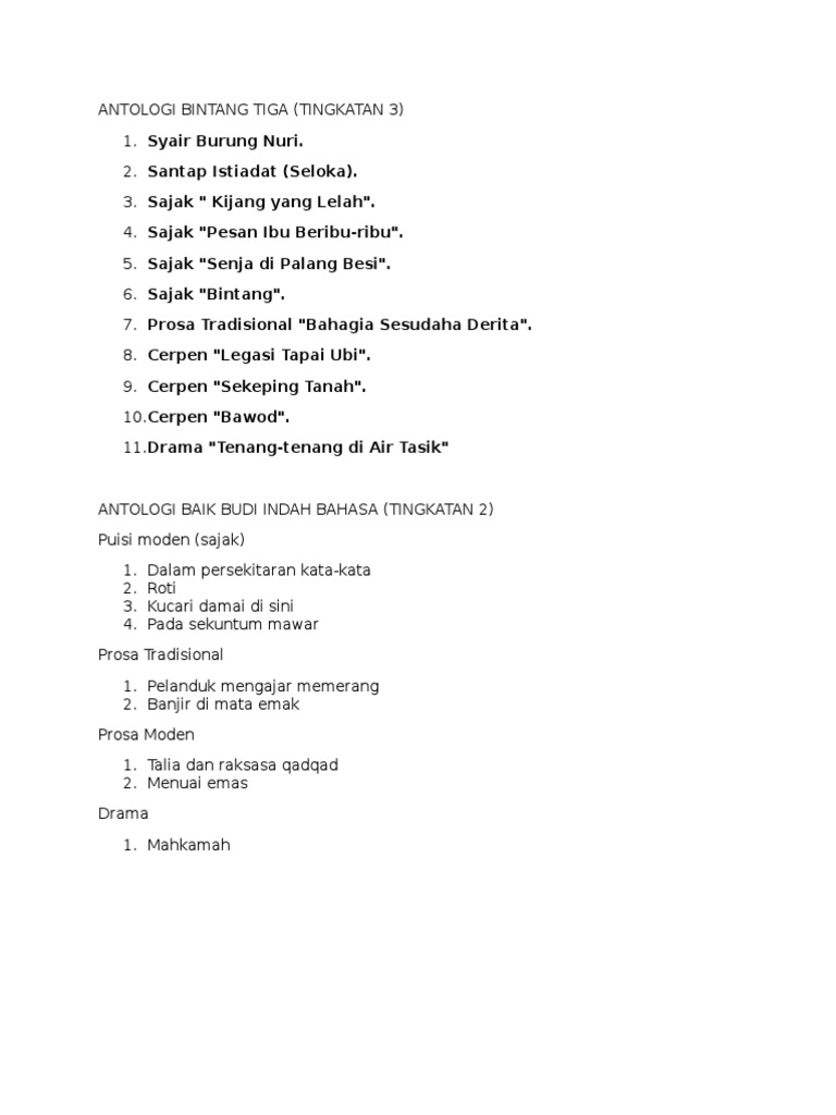 B A H A S A M E L A Y U Senarai Teks Komsas Tingkatan 2 Mulai Tahun 2016
